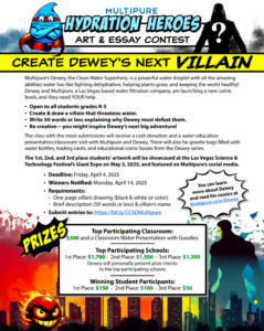 To celebrate the launch of Dewey’s newest comic, Multipure has launched an art and essay contest for students in grades K-5 in the Clark County School District. Just as Dewey fights to keep water clean and protect health, CCSD students will have the chance to create Dewey’s next comic book villain by designing a character that threatens water and writing a compelling 50-word explanation of why Dewey must defeat them. The contest offers exciting opportunities for young creators, including cash prizes for both individual students and schools.